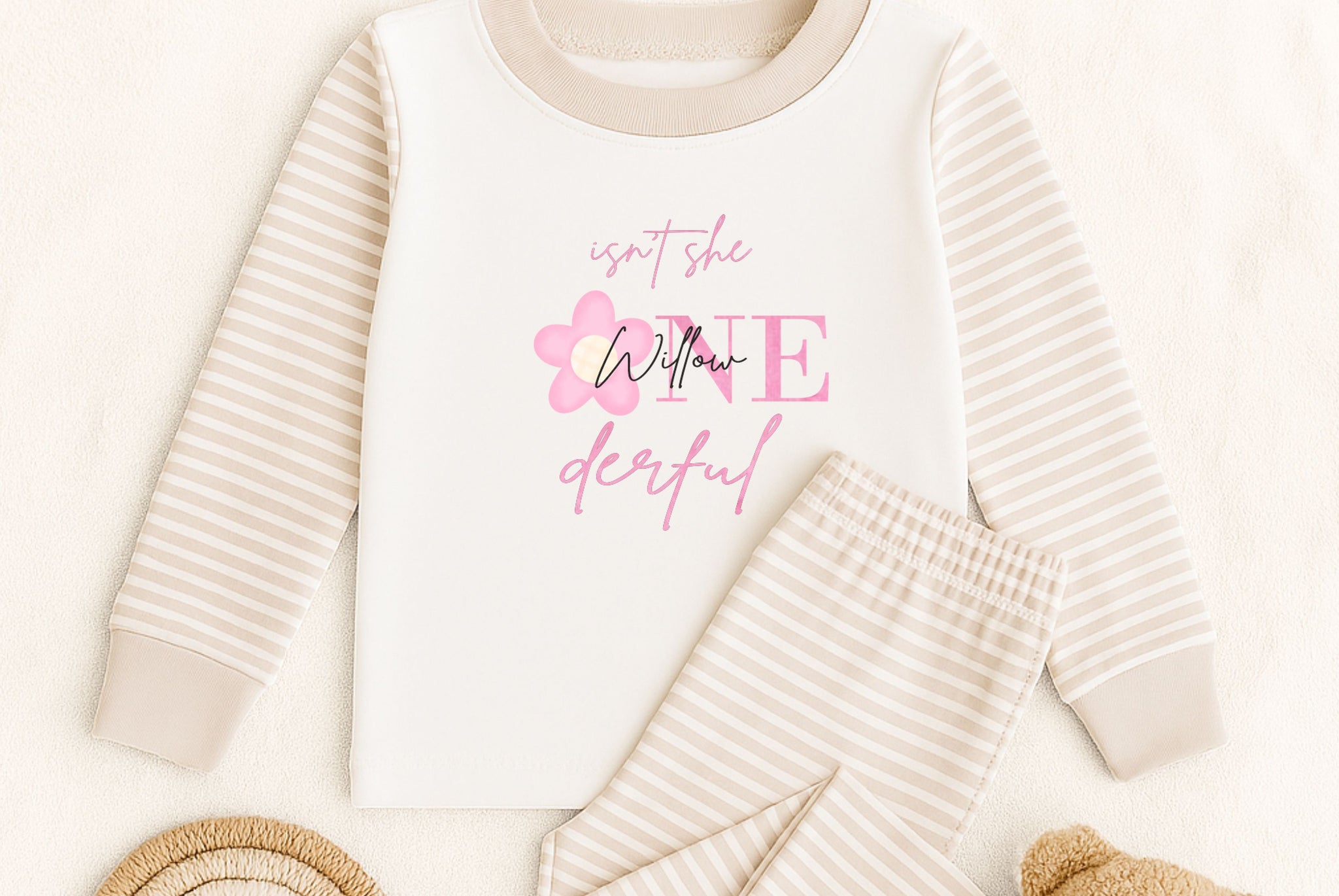 Make their first birthday morning extra magical with these adorable striped pyjamas, lovingly personalised just for them. Featuring the sweet phrase “Isn't She One Derful” in gorgeous lettering and a cute flower and your little one’s name for that extra-special touch.
