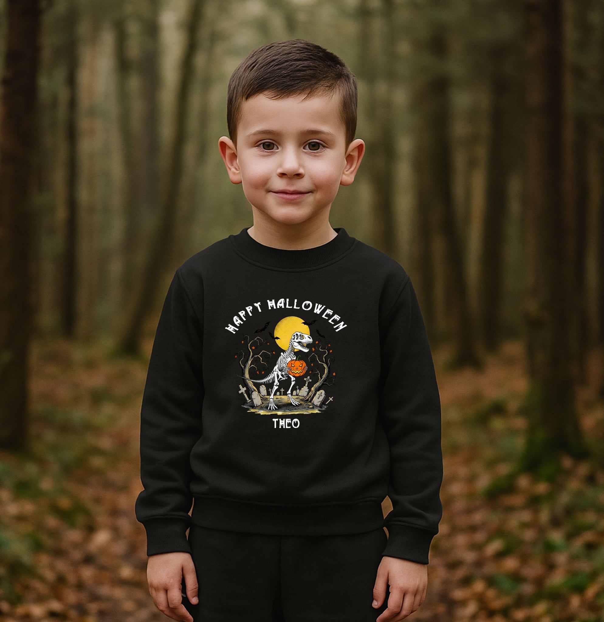 Personalised Spooky Saurus Happy Halloween Sweatshirt ~ Trick or Treat Dinosaur Design ~ Gift for Boys or Girls Kids