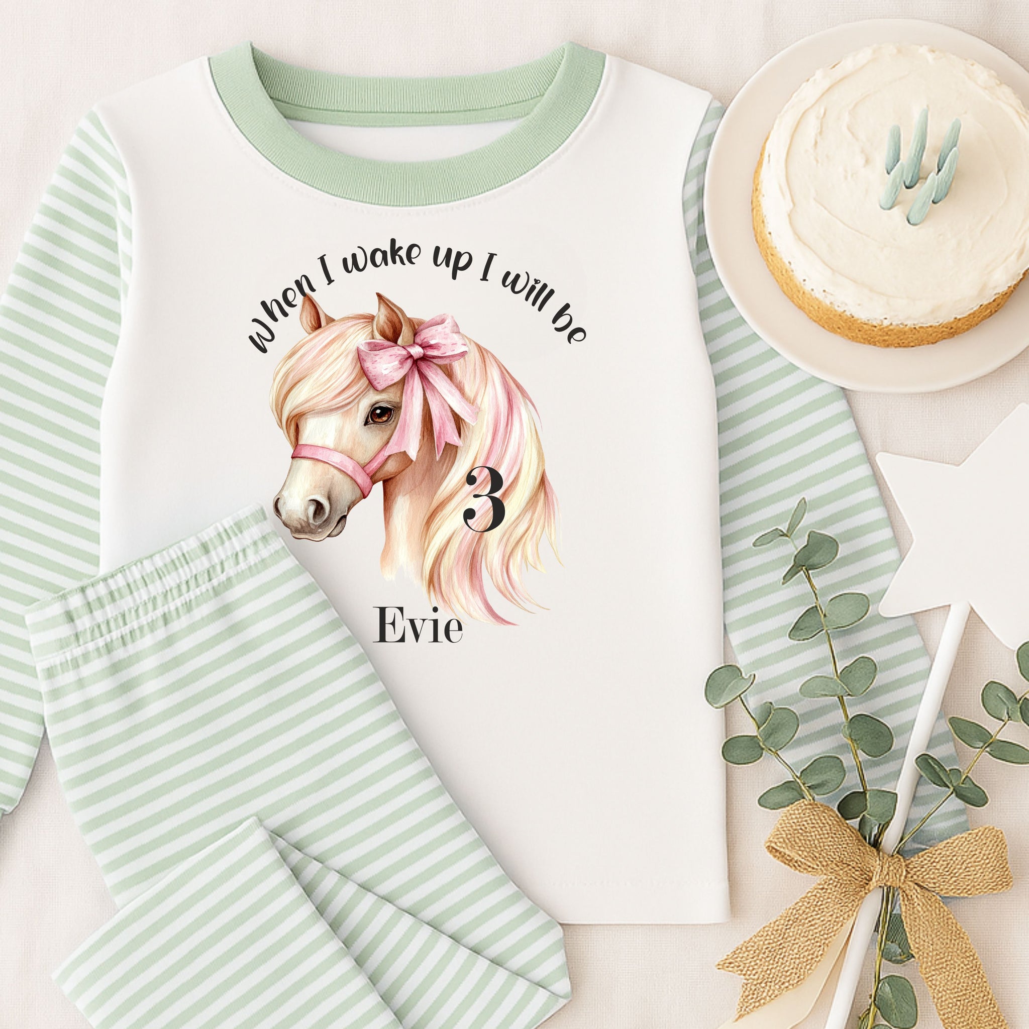 Make their birthday morning extra magical with these beautifully printed pyjamas, featuring a graceful horse head adorned with a pretty pink bow. With the message “When I wake up I will be…” followed by their new age and name, this set is perfect for celebrating in style — and comfort!